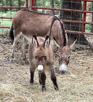 Jodie is considered a rescue that we brought home from Missouri. Only about a month after we brought her home she gave birth to Kenyon, a very social and lovable little boy. We brought Jodie up to date on vaccinations, wormings and hoof trims. They need to go to a home that either already has other donkeys or they can go together or puchased with one of our other "non-rescues" (see our for sale page). Again, each rescued donkey or group of donkeys has different adoption fees only to recoup what we have invested in them since we don't live on donations and want to coninue occasional rescue. We can only do that if we recoup our expenses. We want them to have their own forever home! Both have been adopted... Adopted out to Kentucky, Tennessee and Arizona (2016) This is a group of three donkeys and a goat that we saved from going to auction - with only one place to go - that I don't even want to think about. Billy Bob is a 7-8 year old billy goat pictured in the top row. Ginger is an overweight 16 year old gray jenny pictured in the second row along with Greta (brown) that is in her 20's and only has one eye. She has been rescued once before through another rescue because her former owner abused her, resulting in the loss of her eye. Goose is the gelding and he is also 16 or 17 years old (last three pictures),They are very sweet donkeys and have been at the same home for the past 12 years. While we first thought that they should be placed together, we think it is better for Greta (the oldest not to be placed with the goat because the goat thinks he is a donkey and wants to ride her constantly. He doesn't do that with the others.). Greta can be placed preferrably with Ginger or to a place that already has another old donkey. Ginger can go to a place with other donkeys if she can't remain with Greta. For Greta it would be best not to have to climb any hills. All of them are friendly including Billy Bob! All have been adopted out: Goose stayed in Kentucky, Billy Bob was adopted out to Arizona and Greta and Ginger went to Tennessee together. Adopted out to Malibu, Ca along with Olina Kelly is a 7 or 8 year old rescue jenny with a cute little boy at her side (DOB: 30. Sept. 2016). He is super social and she is a sweet girl. Adopted out to Hickory, Ky Mary is about 10 years old and has an adorable black/gray little boy (DOB: 06. Oct. 2016) at her side. When Mary came to us her hooves were in horrible shape but we have really gotten them back into shape. Two sweet donkeys..... Adopted out to Indiana Lori is a stunningly colored 8 or 9 year old rescue jenny that gave birth to an adorable little spotted boy (DOB: 9. Sept. 2016). Her little boy is very colorful as well, beautiful spot pattern and the cutest little face. Adopted out to Malibu, Ca along with Kelly Olina is a 7 year old jenny and the last of the rescue girls to give birth to a sweet little girl! (12. Oct, 2016). If someone would like two jenny/foal pairs Olina and Kelly came here as friends.